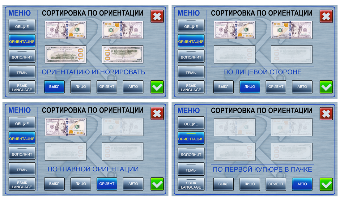 Сортировщик банкнот Dors 800 KZT/RUB/USD/EUR/CNY с проверкой подлинности по четырем машиночитаемым признакам (ИК и видимое изображение, отсутствие фонового свечения банкнотной бумаги в УФ свете, наличие МГ меток), определением номинала, а также с функцией сортировки по номиналу и ориентации. Режимы работы:- простой пересчет;